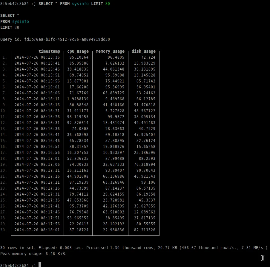 위 과정을 완료하면 NATS의 'system.info' subject로 publish한 메세지들을 Clickhouse의 sysinfo 테이블에서 확인할 수 있다.