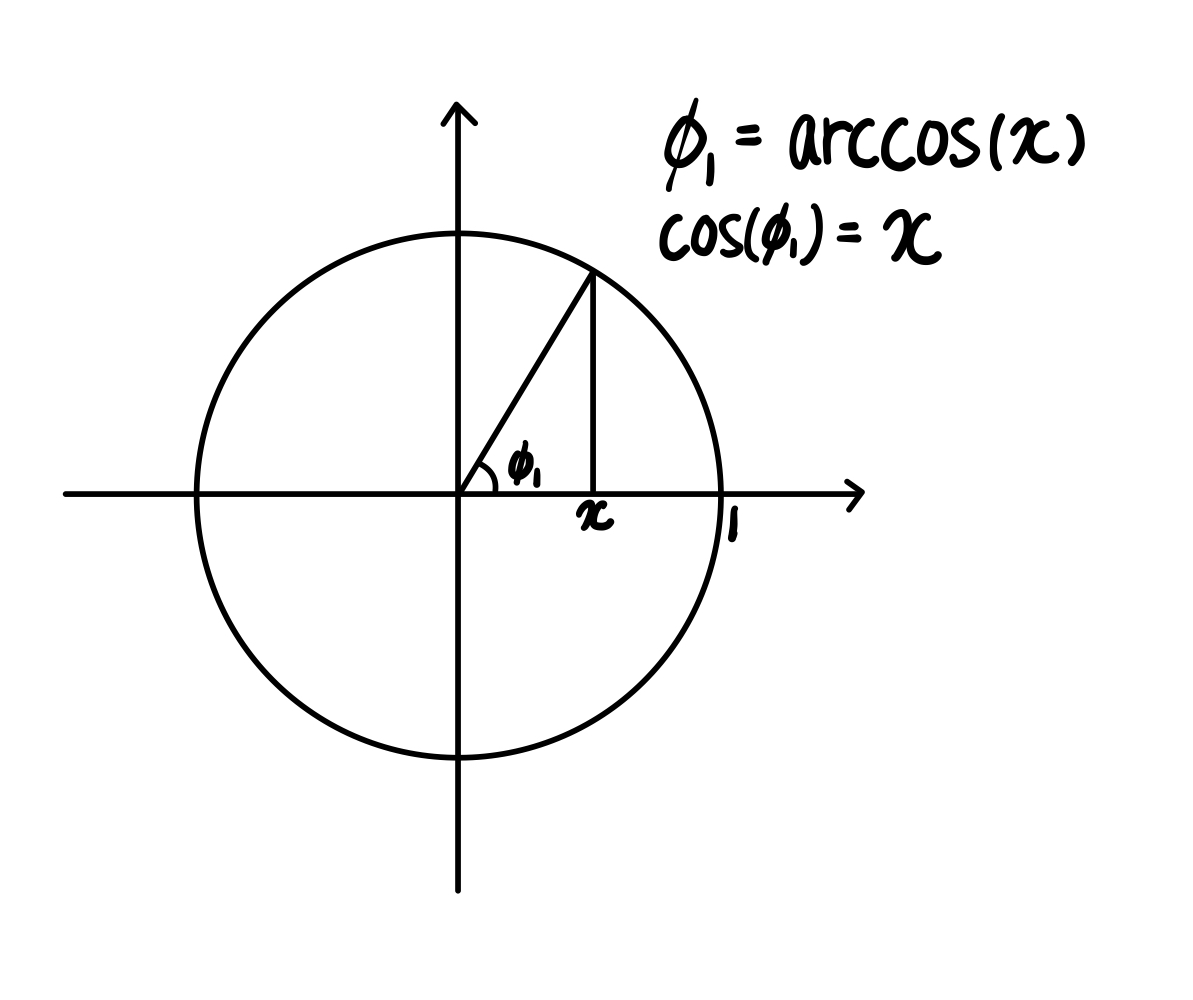 - 아래와 같이 반지름이 1인 원을 예시로 보면, $cos(\phi)=x$ 이고, 우리는 현재 $\phi$가 아닌 $x$ 값을 알고 있으므로 이를 역함수로 나타내면 \phi=arccos(x) 이다. 따라서 $cos(\phi_1 + \phi_2)$를 정규화된 신호인 $\tilde{x}$를 사용하여 $\cos(\arccos(\widetilde{x}_{1}) + \arccos(\widetilde{x}_{2}))$ 로 표현할 수 있다.