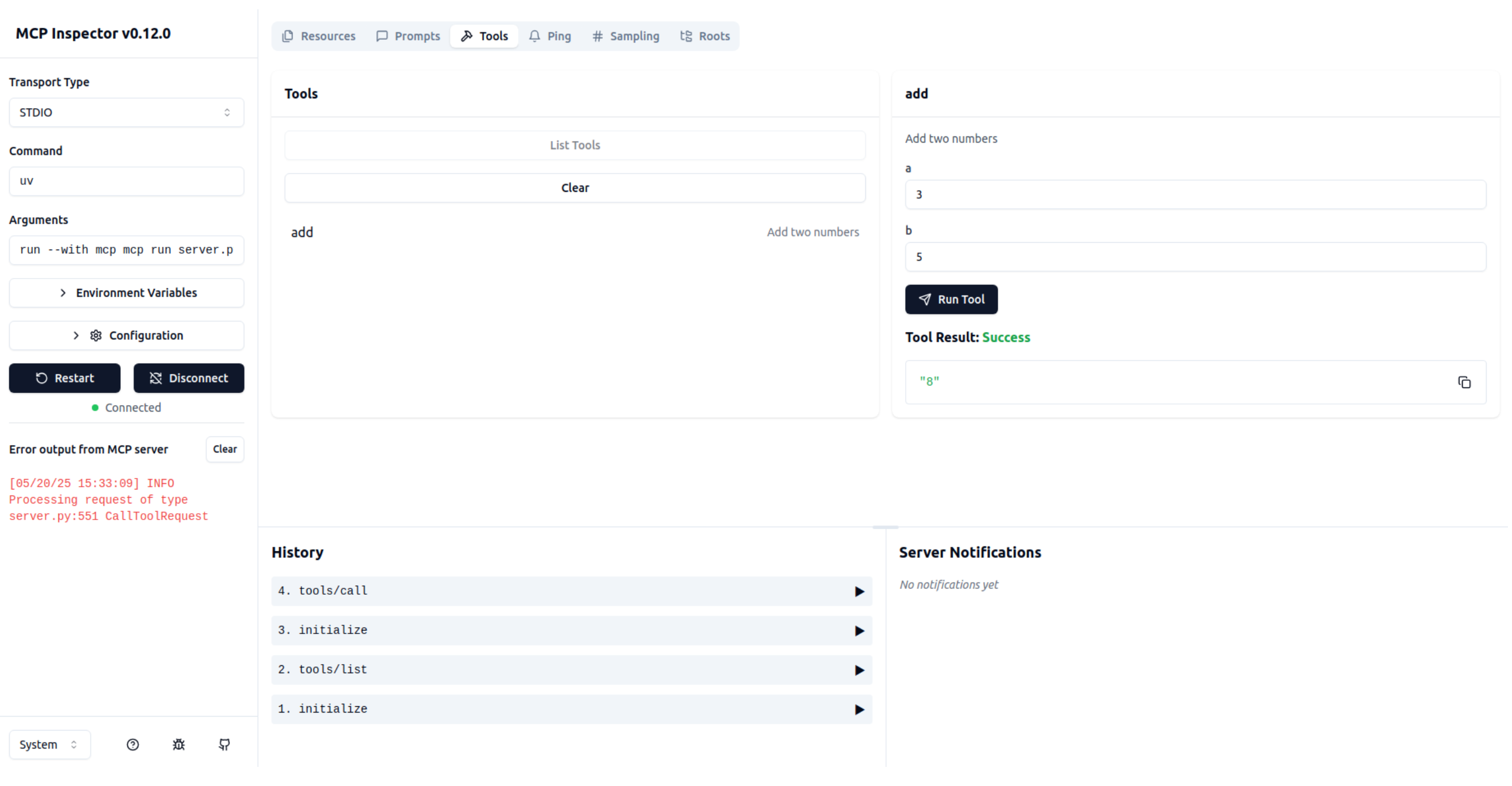 - mcp dev server.py로 실행하면 다음과 같이 MCP Inspector를 사용할 수 있다.